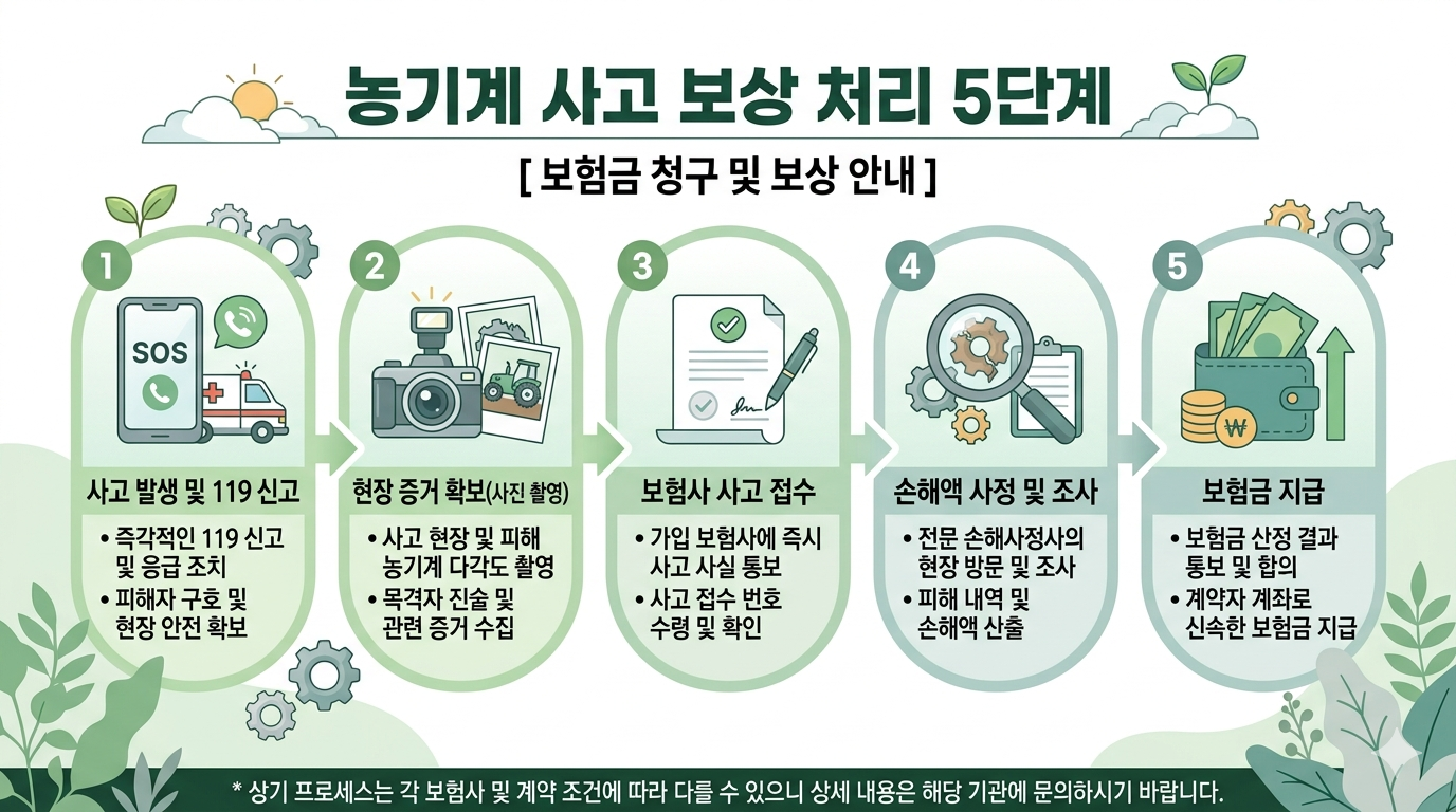 - 필수 서류: 사고증명서(경찰서 발행), 보험금 청구서, 진단서 및 치료비 영수증, 농기계 수리 견적서 및 사진 등.