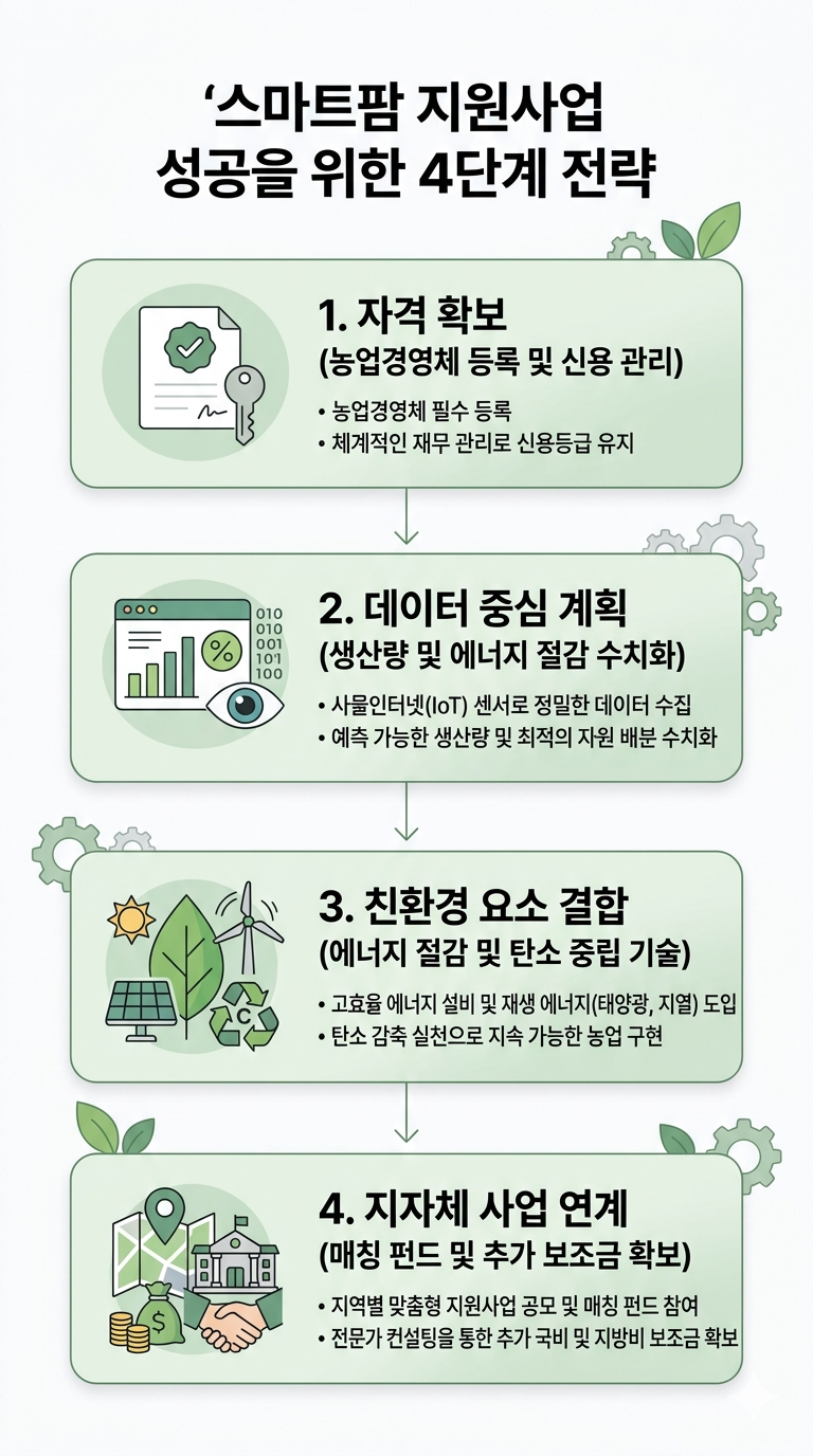 - 접근법: 사업계획서에 발광다이오드(LED) 보광등 활용 계획, 빗물 재활용 시스템, 혹은 고효율 냉난방기 도입 계획을 포함시키십시오. 친환경 농업 자재 사용 계획까지 곁들인다면 가점을 확보하는 데 매우 유리합니다.